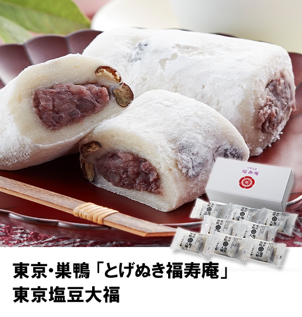 東京・巣鴨の和菓子店「とげぬき福寿庵」監修。国産小豆・国産もち米粉を使用し、あんこをお餅で巻いた塩豆大福です。