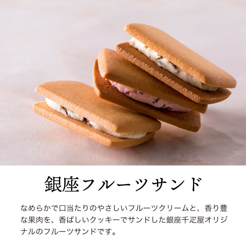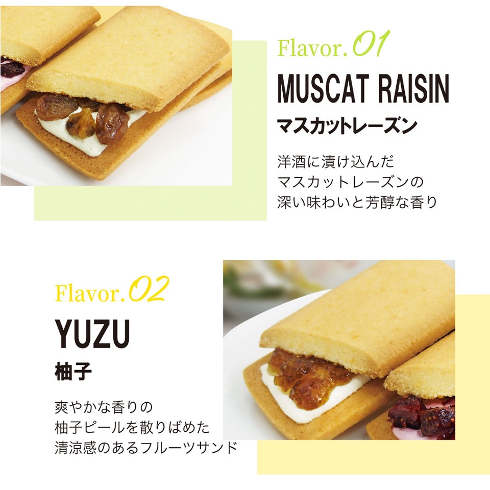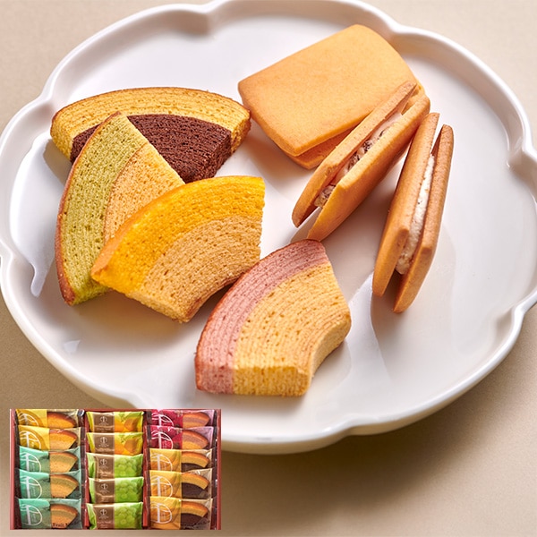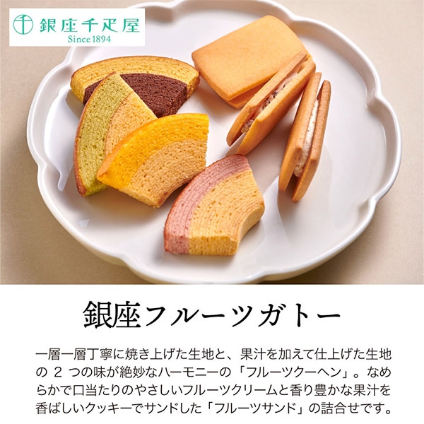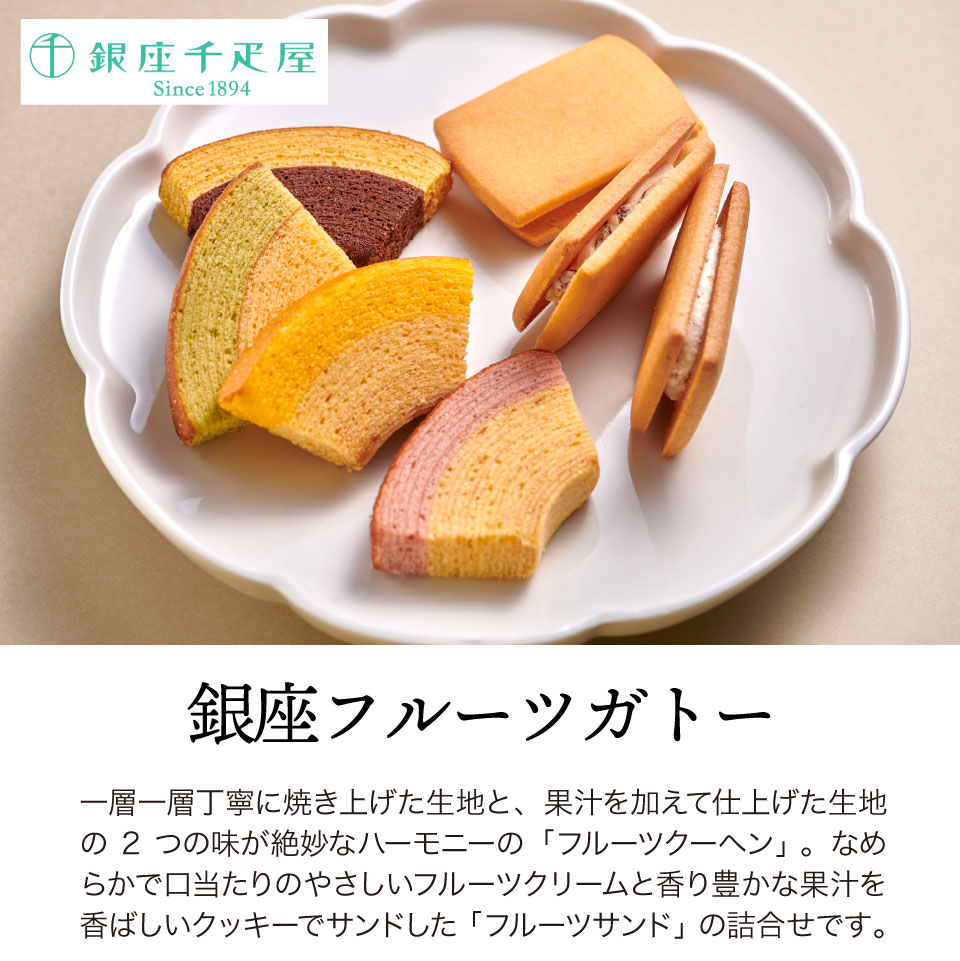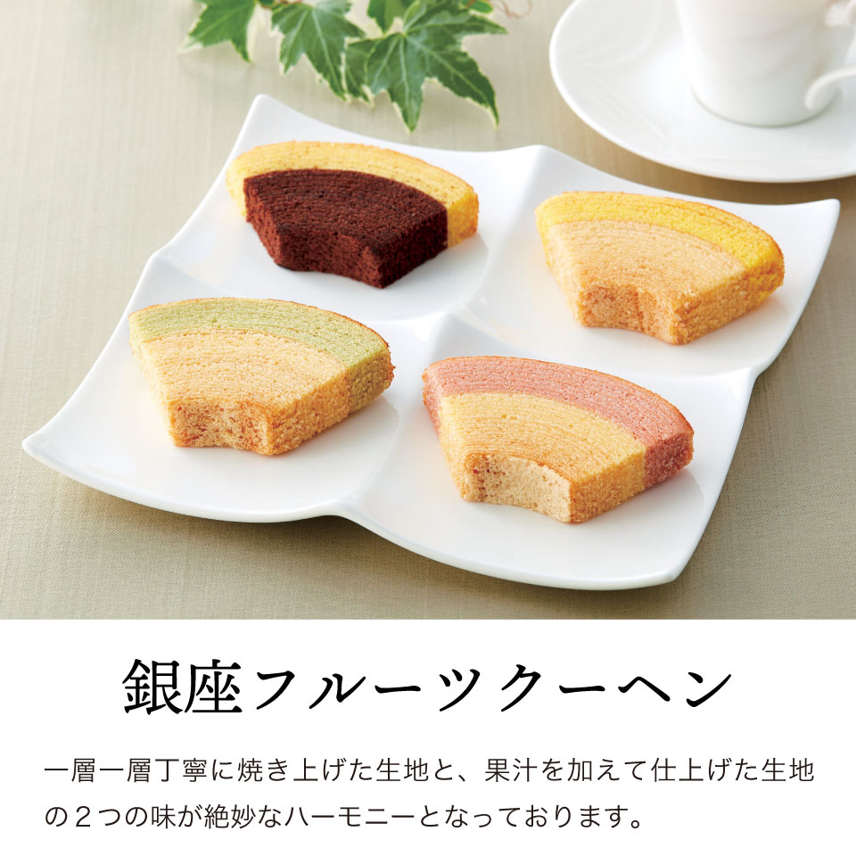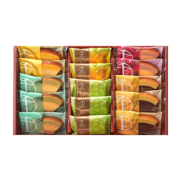 一層一層丁寧に焼き上げた生地と、果汁を加えて仕上げた生地の2つの味が絶妙なハーモニーの「フルーツクーヘン」 。なめらかで口当たりのやさしいフルーツクリームと香り豊かな果汁を香ばしいクッキーでサンドした「フルーツサンド」の詰合せです。