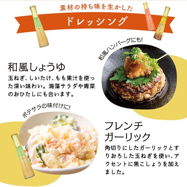 ●ジャム145g×2(オレンジマーマレード、いちご)、ドレッシング122ml×2(フレンチガーリック、和風しょうゆ)●箱:約22.5×19×6cm【賞味期限:メーカー製造より常温300日】【乳成分・小麦】
