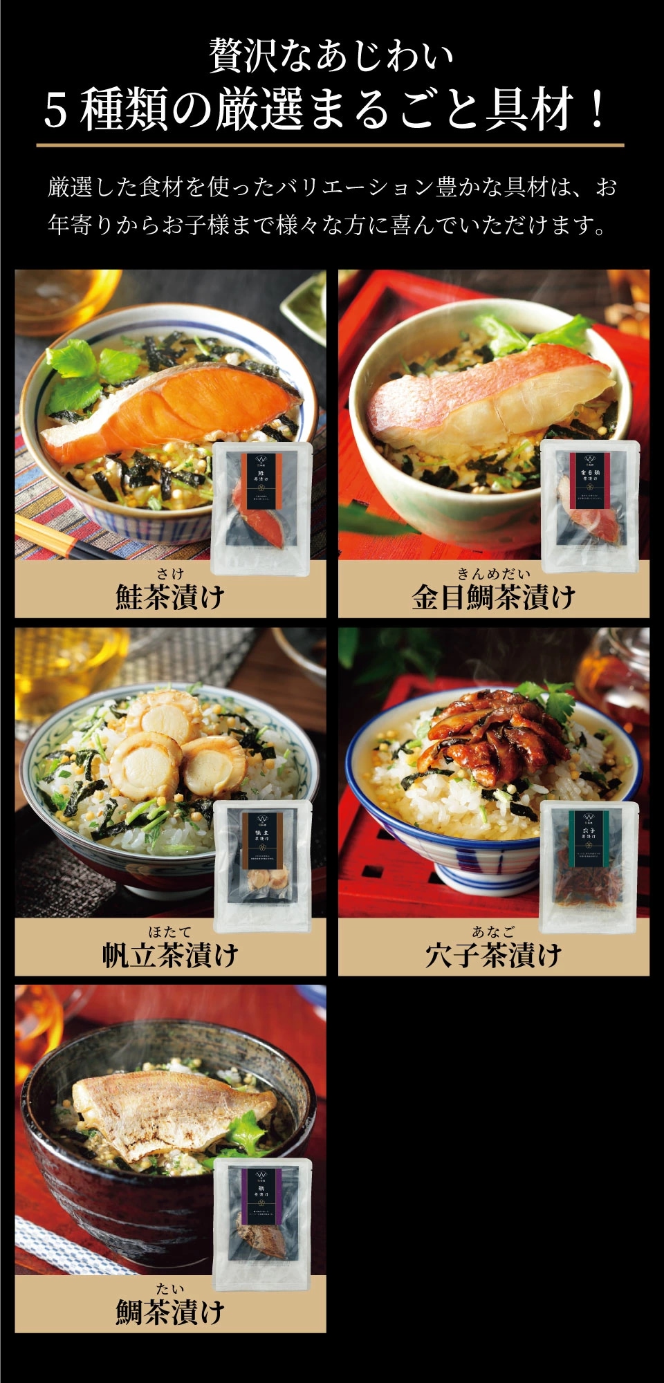 ●お茶漬け(金目鯛・穴子・鮭・鯛・帆立)各1、だしつゆ×5、具材×5