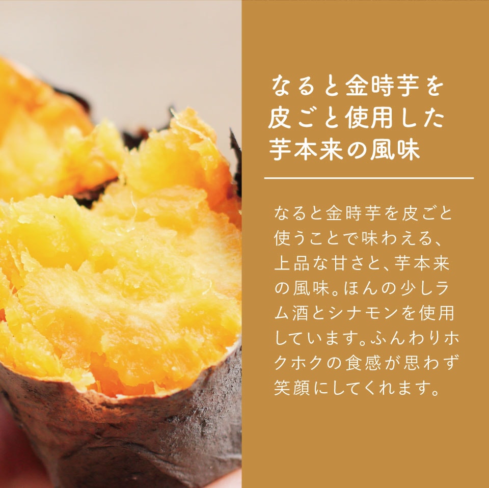 鳴門金時芋を皮ごと使用し粗めにつぶしたことで鳴門金時芋の上品な甘さと芋本来の風味をお楽しみいただけます。ひととえ Hitotoe焼き菓子のふんわりホクホクの食感が思わず笑顔にしてくれます。ほんの少しラム酒とシナモンを使用しています。
