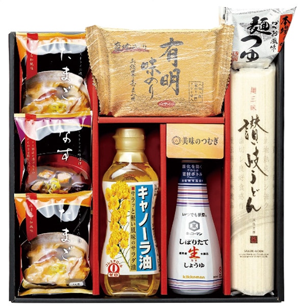キッコーマンの「しぼりたて生しょうゆ」とお湯を注ぐだけで美味しいフリーズドライ味噌汁、白子有明海苔、キャノーラ油にうどんと麺つゆまで貰って嬉しい詰合せです。