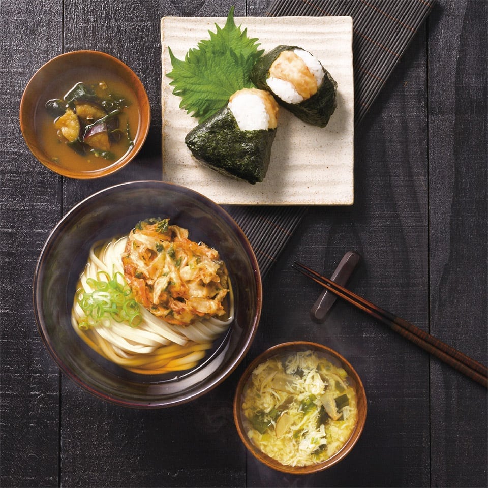 ●現品:たまごフリーズドライスープ4.2g×2袋・なすフリーズドライ味噌汁6.9g・白子有明味のり(8切8枚)・麺つゆ濃縮30ml各1袋・昭和キャノーラ油300g・キッコーマンしぼりたて生しょうゆ200ml各1本・讃岐うどん180g×1個・賞味期限/製造日より常温約360日・【卵・小麦・えび・さば・大豆】