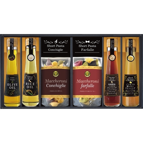 ●ハコ約39.2×21×5.5cm●重量=約1.6kg●エクストラバージンオリーブオイル100g×1、ライスオイル110g×1、ドレッシングタイプ調味料(ノンオイル和風白だし醤油・ノンオイル塩レモン各120ml×各1)、カラーパスタ(コンキリエ60g・ファルファーレ40g×各1)●スペイン、イタリア製【賞味期限:製造より常温240日】【卵・小麦】