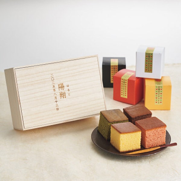 キューブタイプのカステラ4種(プレーン・宇治抹茶・ショコラ・いちご)を紙箱に入れ、名入れした桐箱に入れてお届けします。