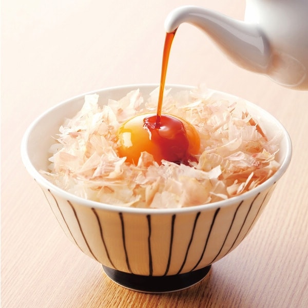 たまごかけご飯を美味しく食べる、かつおとさばのだしが利いた専用醤油と、風味豊かな本枯節かつおパックをパステルカラーのパッケージに詰め合わせました。