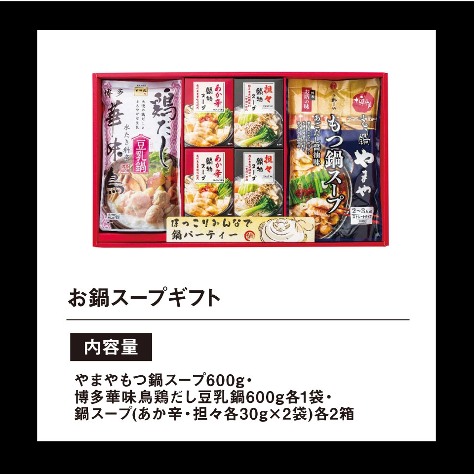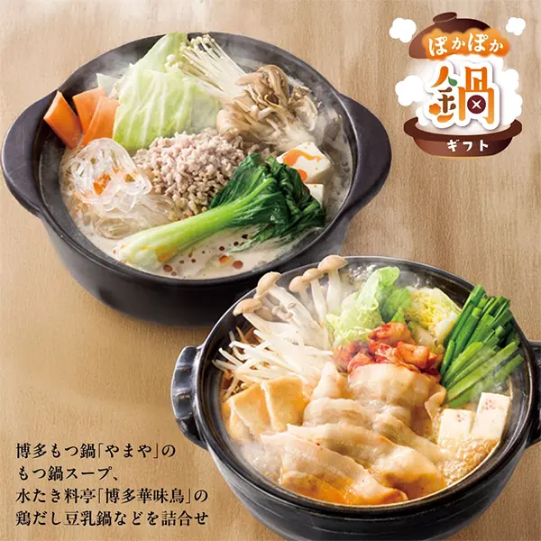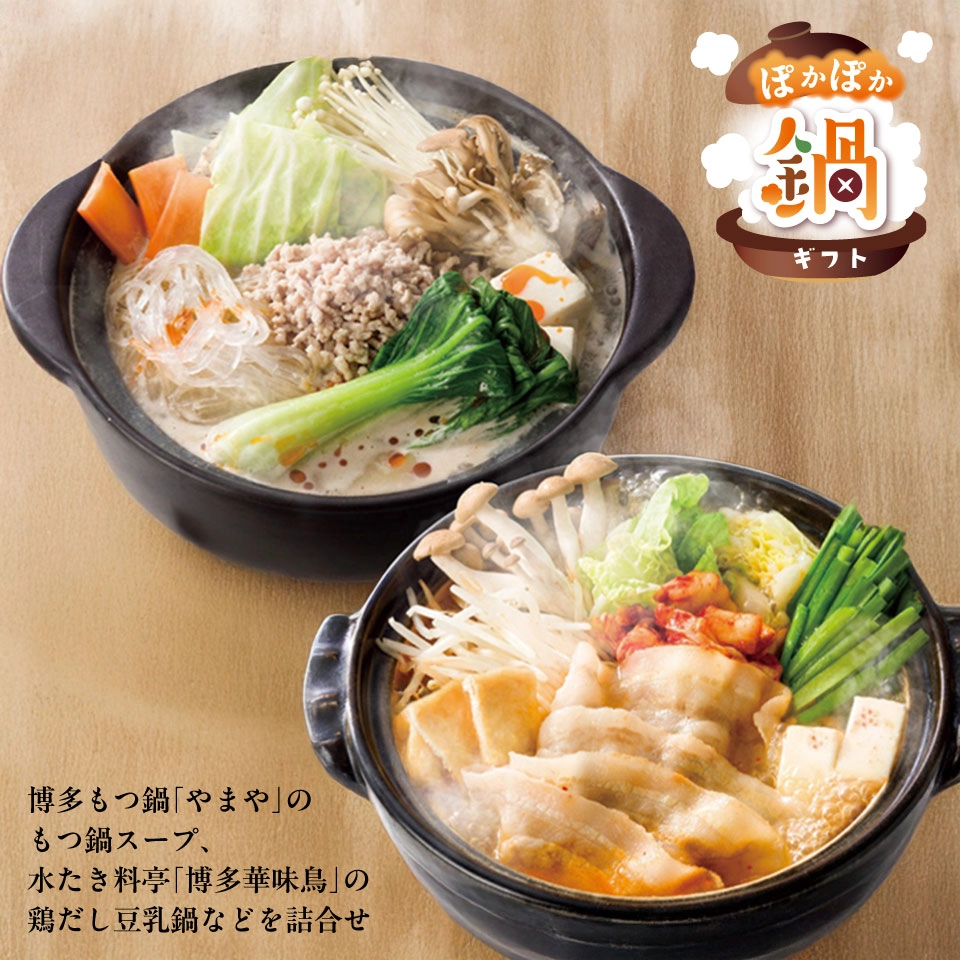 博多もつ鍋「やまや」のもつ鍋スープ、水たき料亭「博多華味鳥」の鶏だし豆乳鍋などを詰合せした冬にぴったりの鍋スープギフトです。