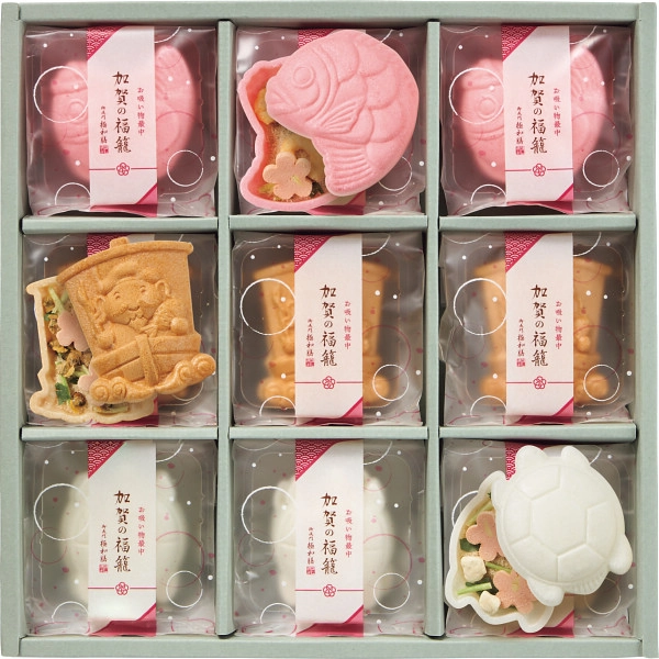 お歳暮限定で、鯛と恵比寿様と亀をモチーフにした、縁起のよいおめでたい最中です。年末年始のご挨拶にもお勧めです。
