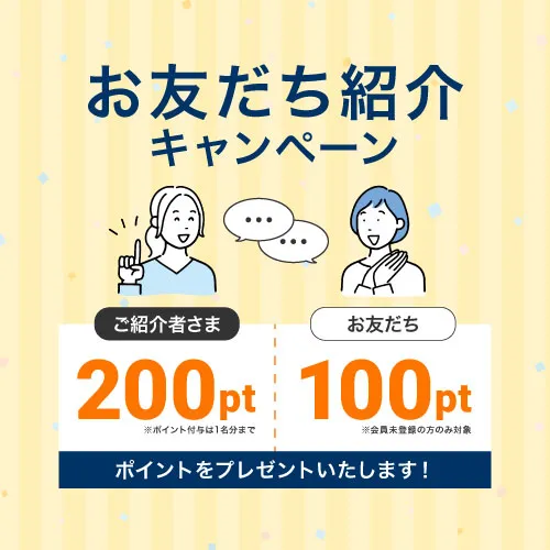 あなたのお友達に、ぜひ当店をご紹介ください!お友達が当店に会員登録すると、紹介した方にも、登録したお友達にもポイントをプレゼントいたします