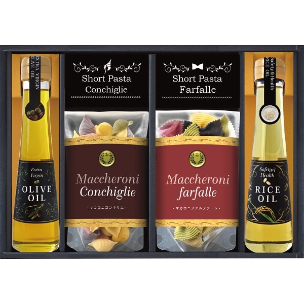●ハコ約28×21×5.5cm●重量=約910g●エクストラバージンオリーブオイル100g×1、ライスオイル110g×1、カラーパスタ(コンキリエ60g・ファルファーレ40g×各1)●日本、スペイン、イタリア製【賞味期限:製造より常温540日】【卵・小麦】