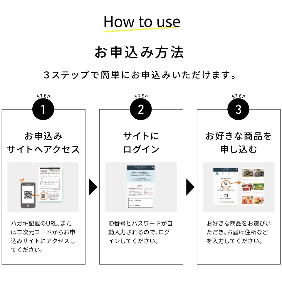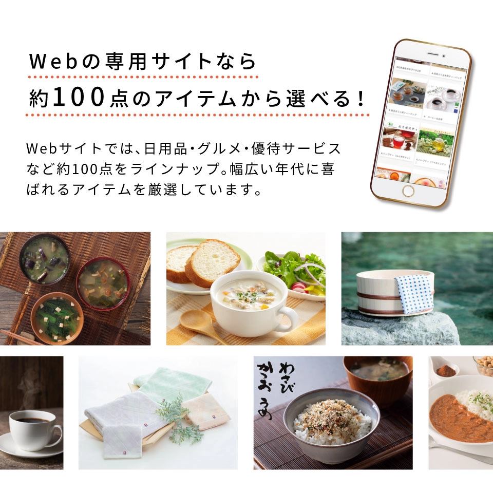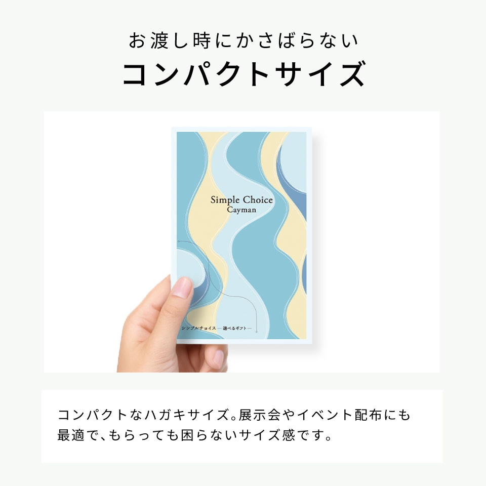 1,100円〜3,300円まで、ご予算に合わせて選べる5コースのカタログギフト。ハガキサイズのコンパクト設計で、配布や郵送にも便利。また、ショップカードやメッセージカードを同封可能なので、展示会・成約記念・キャンペーン粗品など、法人様の販促ツールとしても最適です。