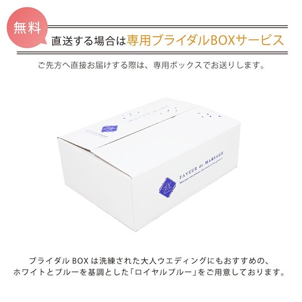 こちらの商品は「ご先方様へお届け」する個別配送となりますので、専用のブライダルボックスに入れて大切にお届けいたします。ブライダルボックスは洗練された大人ウェディングにもおすすめの、ホワイトとブルーを基調とした「ロイヤルブルー」をご用意いたしております。