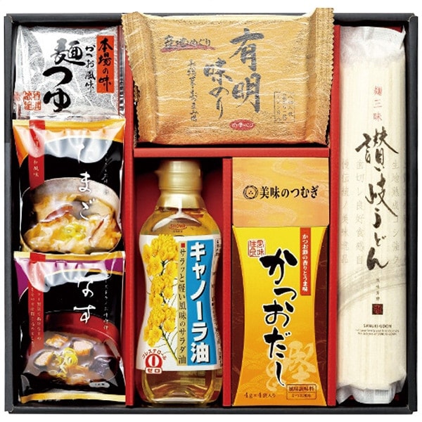 お料理に役立つかつおだしとお湯を注ぐだけで美味しいフリーズドライ味噌汁、白子有明海苔、キャノーラ油にうどんと麺つゆまで貰って嬉しい詰合せです。