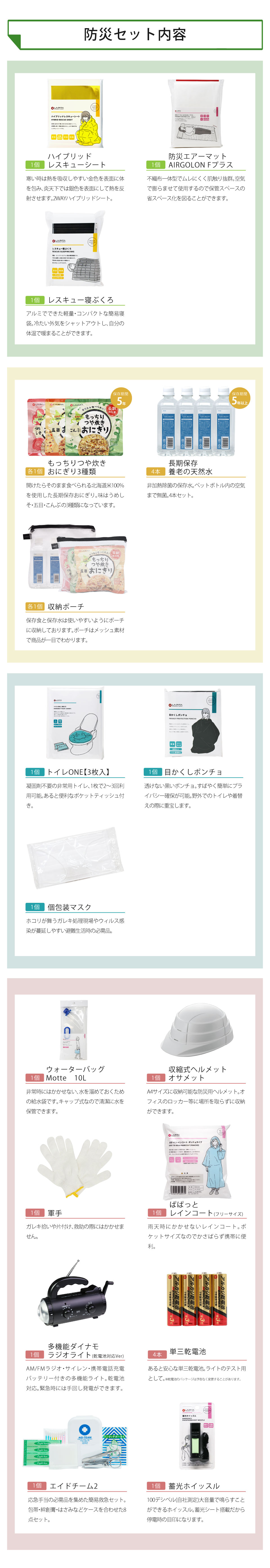 ●商品本体サイズ:330×460×160mm●セット内容:防災リュック×1、多機能ダイナモラジオライト(乾電池対応)×1、ウォーターバッグMotte 10L×1、ハイブリッドレスキューシート×1、トイレONE(3枚入)×1、エイドチーム2(簡易救急セット)×1、ぱぱっとレインコート(フリーサイズ)×1、個包装マスク×1、蓄光ホイッスル×1、軍手×1、目かくしポンチョ×1、もっちりつや炊きおにぎり(こんぶ・うめしそ・五目)×各1、長期保存養老の天然水×4、メッシュ素材ポーチ×2、単三乾電池(4本)×1、収縮式ヘルメット オサメット×1、レスキュー寝ぶくろ×1、防災エアーマットAIRGORON Fプラス×1【もっちりつや炊きおにぎり・養老の天然水/保存期間:製造より5年】