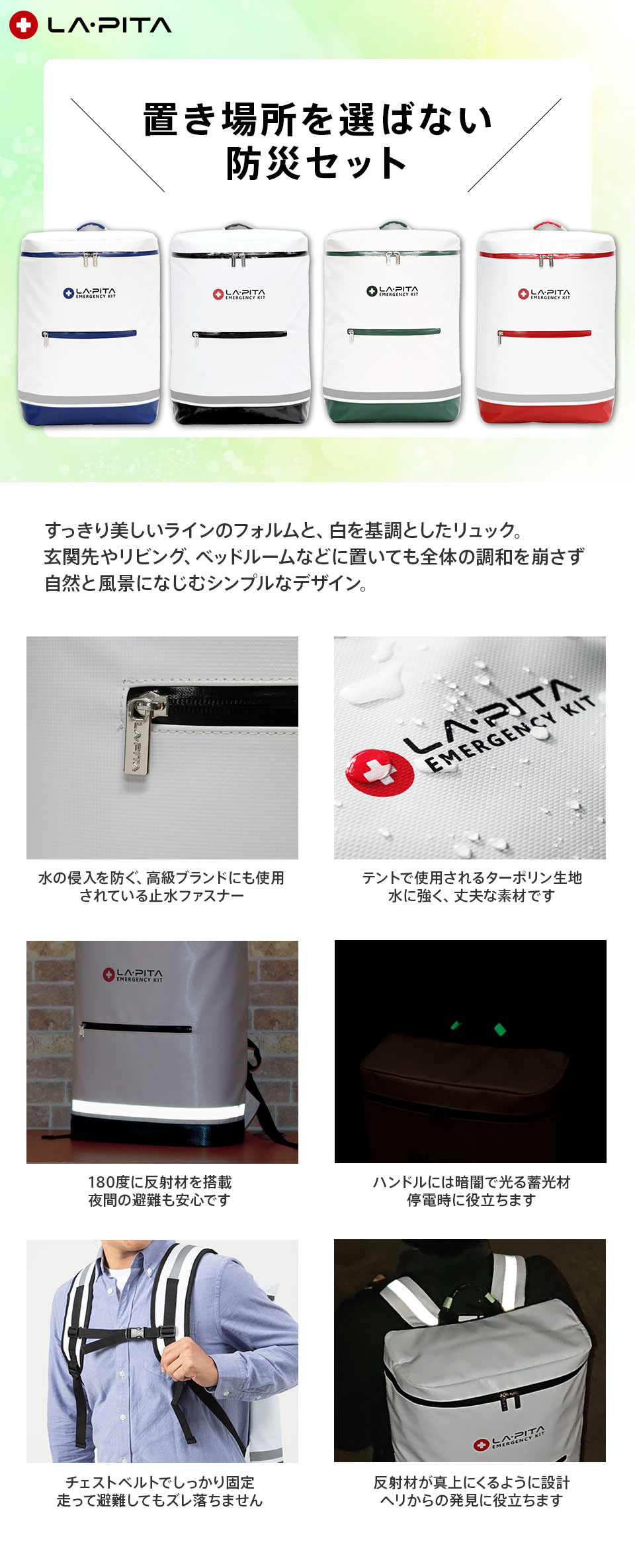 リュック下部には180度に反射材を搭載しているので夜間の避難も安心です。ハンドル(持ち手)には暗闇で光る蓄光材も。停電時に役立ちます。ショルダーベルトの反射材は真上に来るように設計されているので、ヘリからの発見に役立ちます。