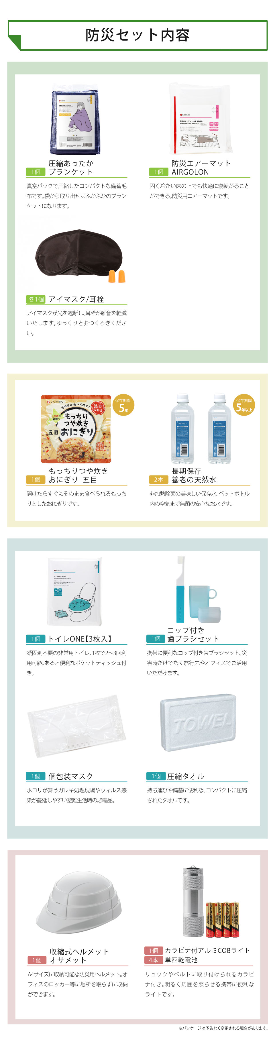 ●商品本体サイズ:約340×240×110mm●セット内容:椅子掛けバッグ×1、長期保存養老の天然水500ml×2、収縮式ヘルメット オサメット(ホワイト)×1、圧縮あったかブランケット×1、もっちりつや炊きおにぎり(五目)×1、トイレONE(3枚入り)×1、個包装マスク×1、アイマスク×1、耳栓×1、カラビナ付きアルミCOBライト×1、単四電池×1、圧縮タオル×1、コップ付き歯ブラシセット×1、防災エアーマットAIRGOLON×1【もっちりつや炊きおにぎり・養老の天然水/保存期間:製造より5年】