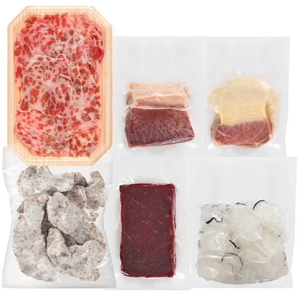 ●現品:鯨竜田揚げ150g、鯨赤身肉(刺身用)100g、鯨おばいけ100g、鯨舌ボイル90g、鹿の子スライス50g、鯨ベーコンスライス50g