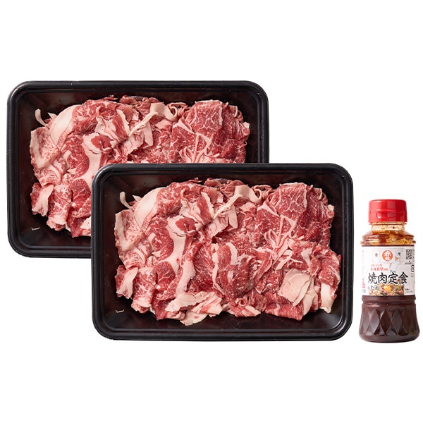●現品:国産こま切れ牛肉200g×2、赤丸焼肉定食のたれ185g