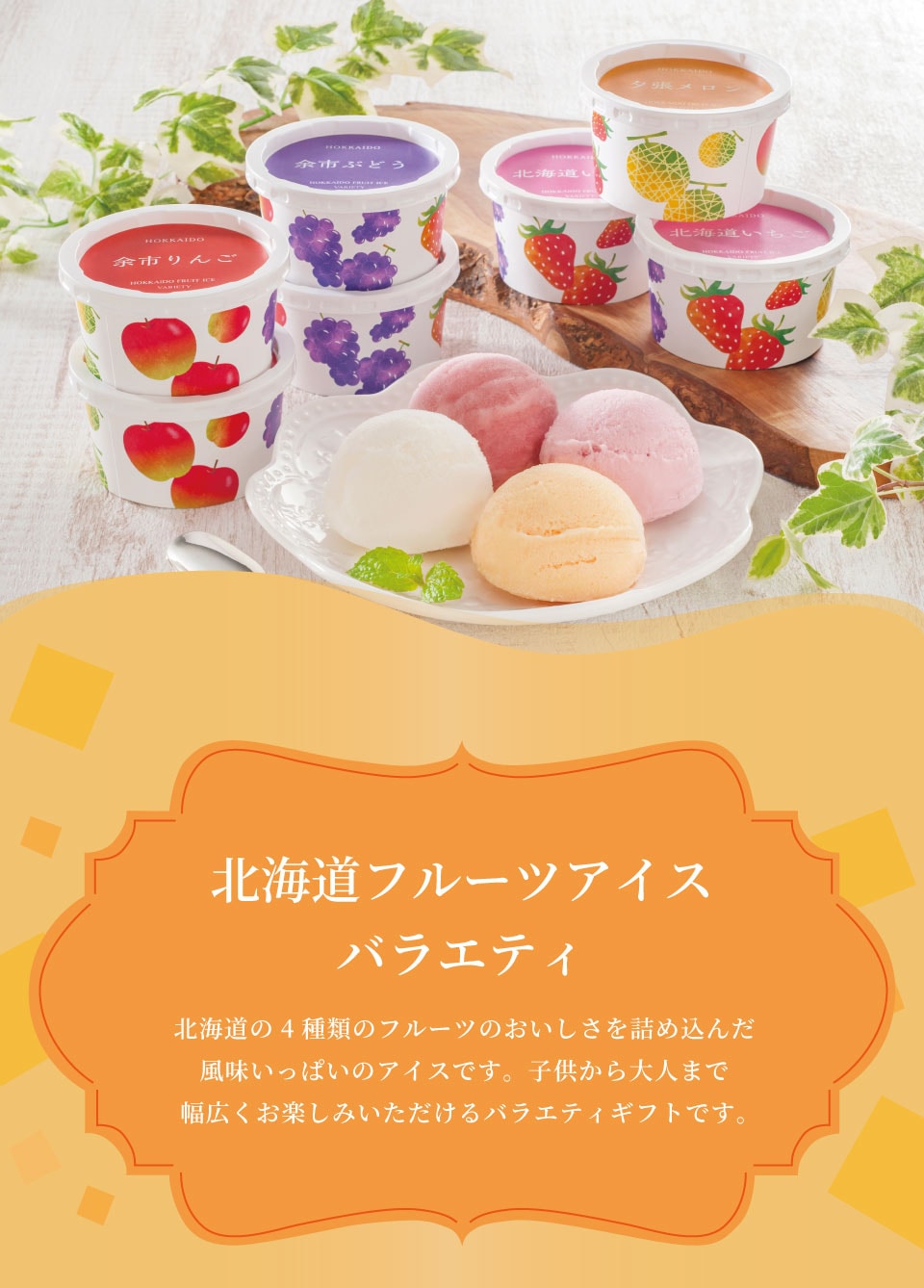 北海道の4種類のフルーツのおいしさを詰め込んだ風味いっぱいのアイスです。子供から大人まで幅広くお楽しみいただけるバラエティギフトです。