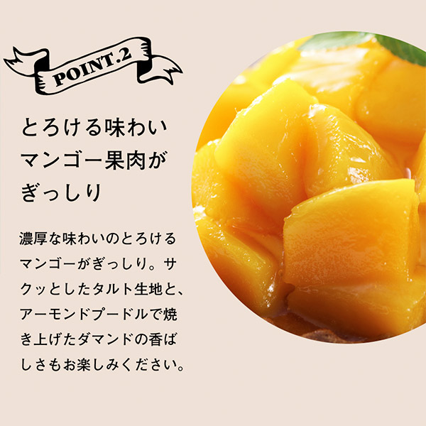 甘さ控えめのなめらかなカスタード風味のクリームは、トロッと柔らかな果肉と美味しく調和し、トロピカルテイストを満喫できます。サクッとしたタルト生地と、アーモンドプードルで焼き上げたダマンドの香ばしさもお楽しみください。