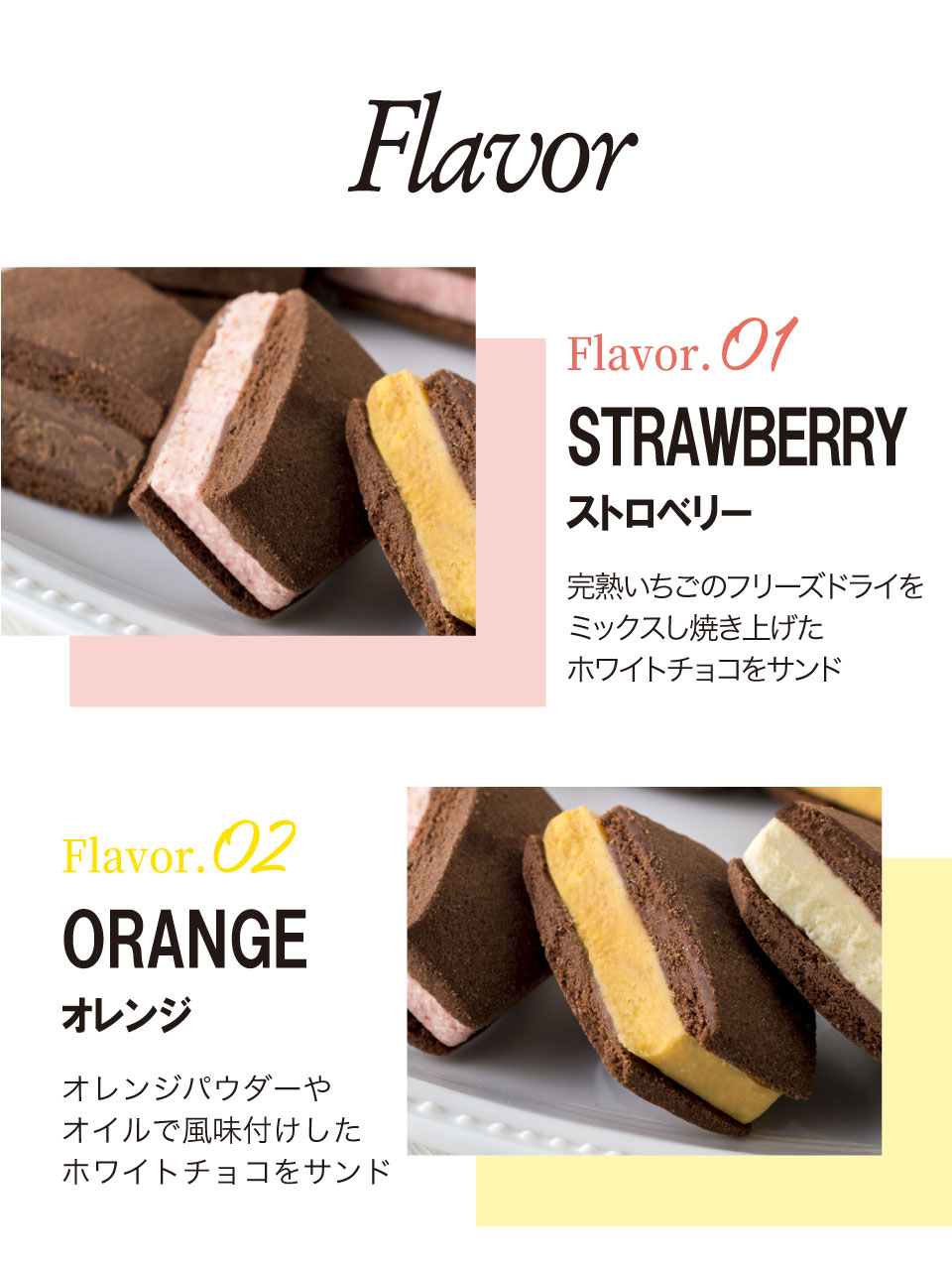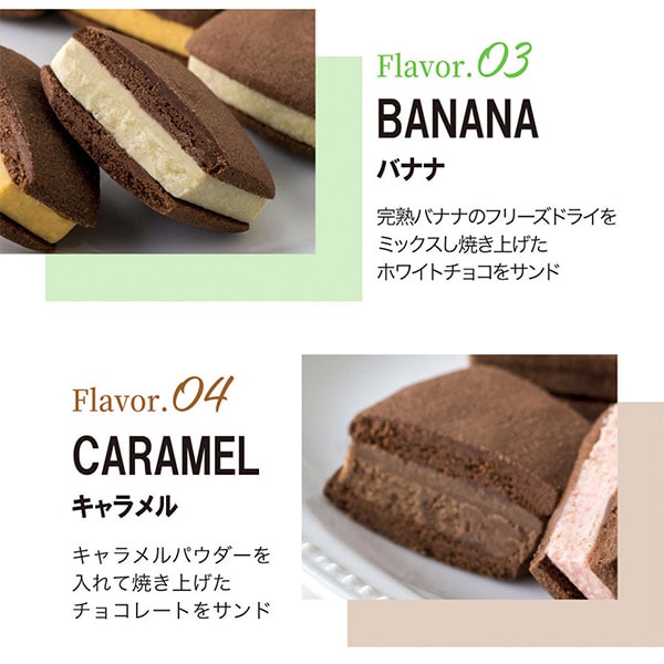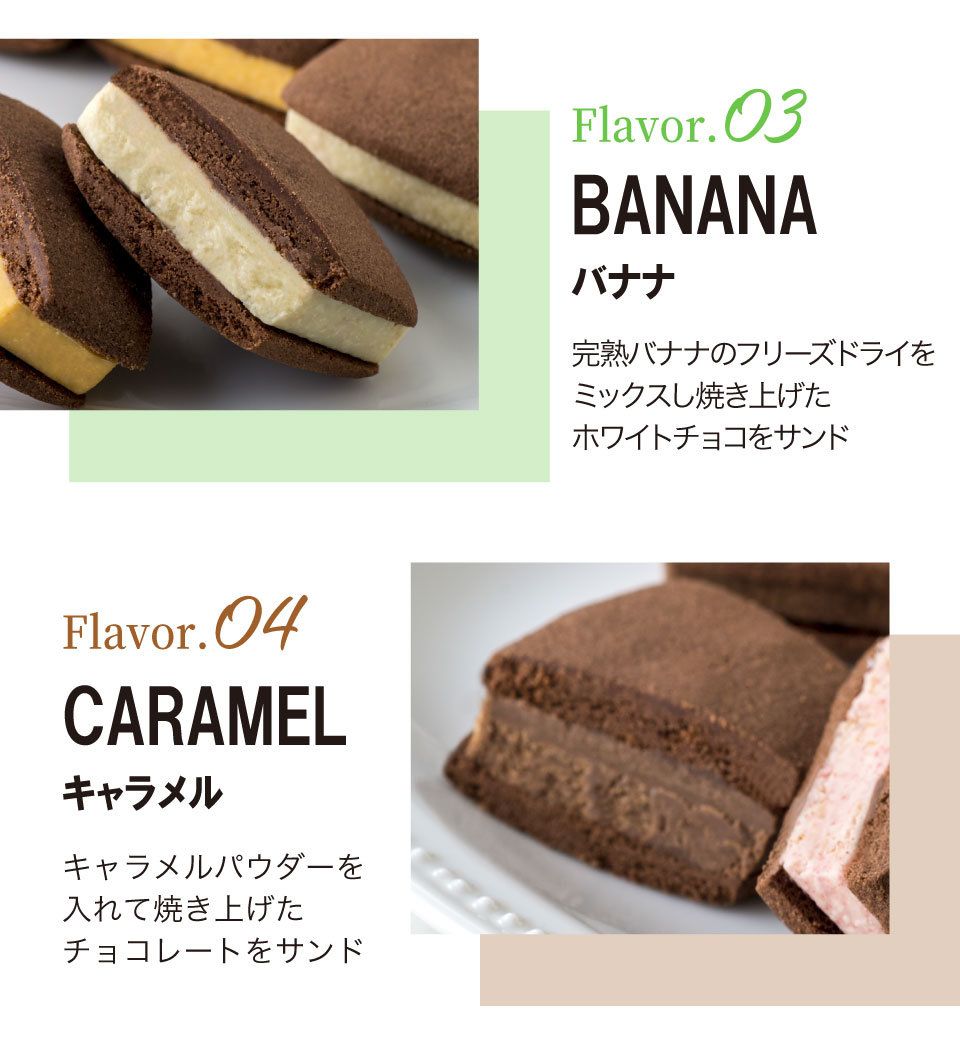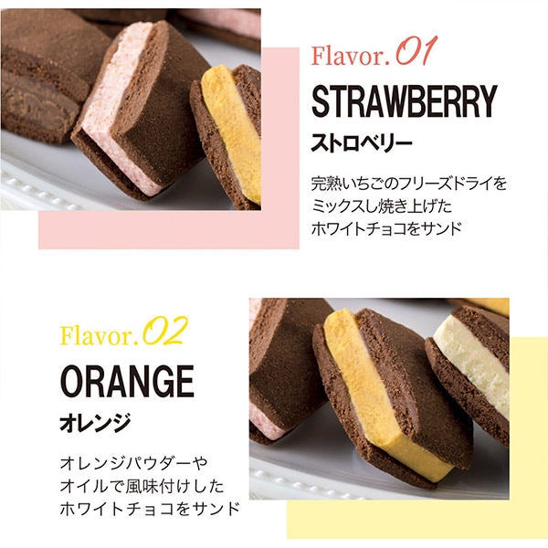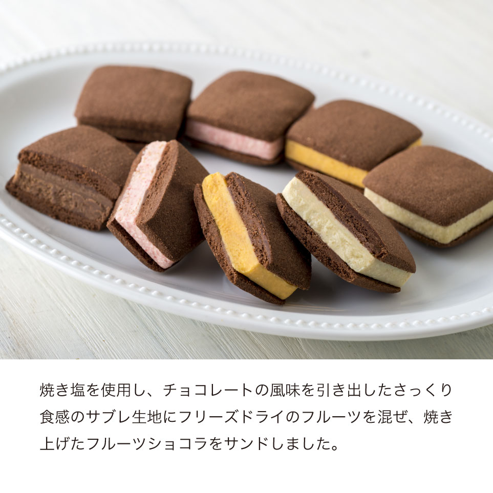 焼き塩を使用し、チョコレートの風味を引き出したさっくり食感のサブレ生地にフリーズドライのフルーツを混ぜ、焼き上げたフルーツショコラをサンドしました。