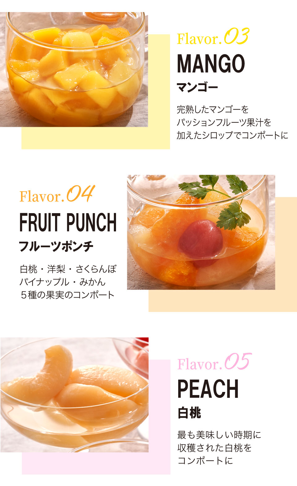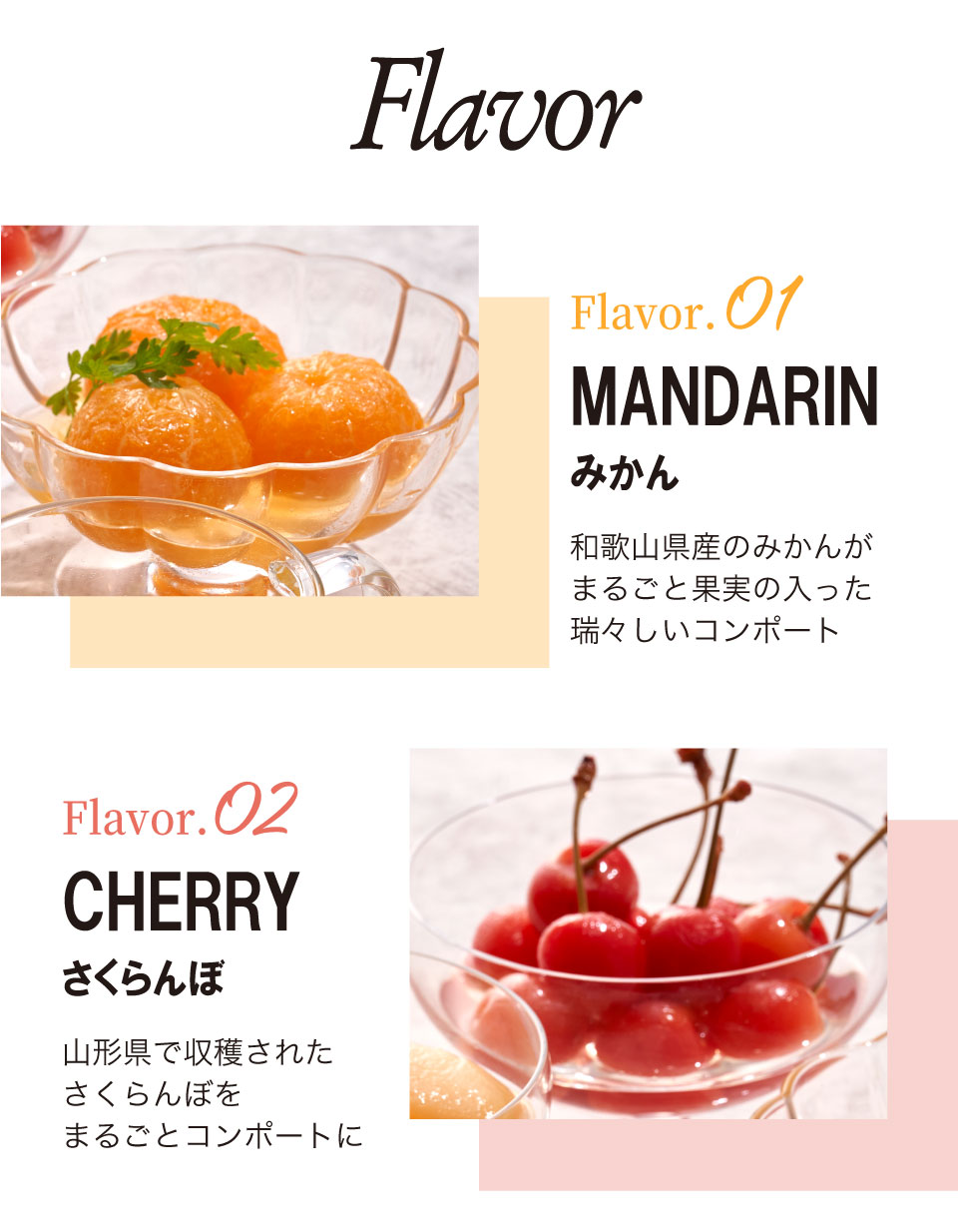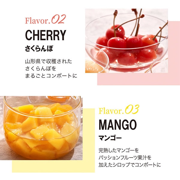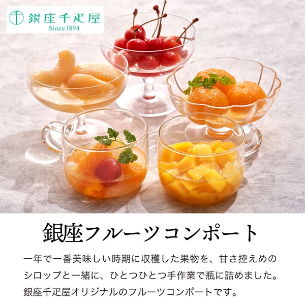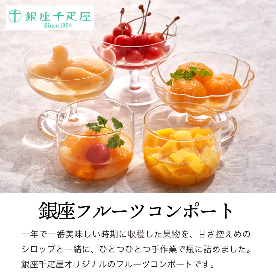 一年で一番美味しい時期に収穫した果物を、甘さ控えめのシロップと一緒に、ひとつひとつ手作業で瓶に詰めました、銀座千疋屋オリジナルのフルーツコンポートです。《みかん》和歌山県産のみかんを余すところなく味わっていただける、まるごと果実の入ったコンポートです。《さくらんぼ》日本一の生産地、山形県で収穫されたさくらんぼをコンポートに仕上げました。《マンゴー》完熟したマンゴーをパッションフルーツ果汁を加えたシロップでコンポートに仕上げた爽やかなコンポートです。《白桃》最も美味しい時期に収穫された白桃を風味豊かなシロップで仕上げたコンポートです。