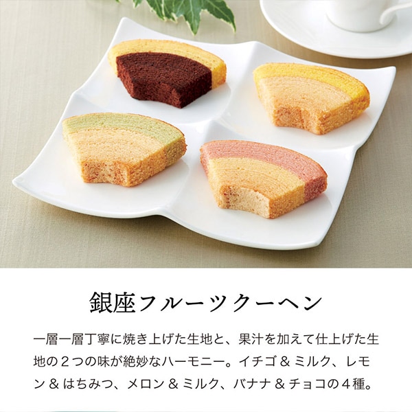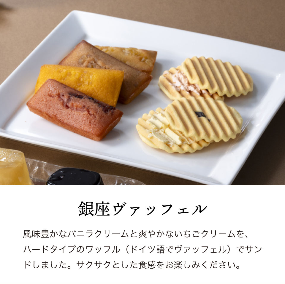 ●現品:銀座ゼリー(ラ・フランス、マンゴー、キウイ、グレープフルーツ、ブルーベリー、さくらんぼ)×各1、銀座フルーツフィナンシェ(ストロベリー、パイナップル、アップル、マロン)×各1、銀座ヴァッフェル(バニラ、いちご)×各1、銀座フルーツクーヘン(イチゴ&ミルク、レモン&はちみつ、メロン&ミルク、バナナ&チョコ)×各1【賞味期限:メーカー製造より常温90日】【小麦・卵・乳成分】