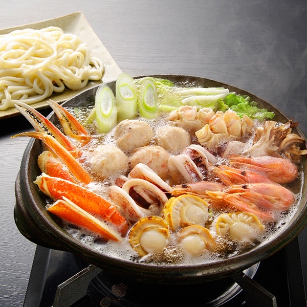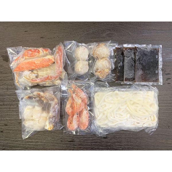 ●現品:ゆでずわいがにカット150g、生たらばがにカット100g、ボイル海老×3尾、ボイル帆立×2個、かに入つみれ×2個、冷凍うどん250g×1玉、たれ(濃縮:醤油仕立て)50ml×3袋(1〜2人前)