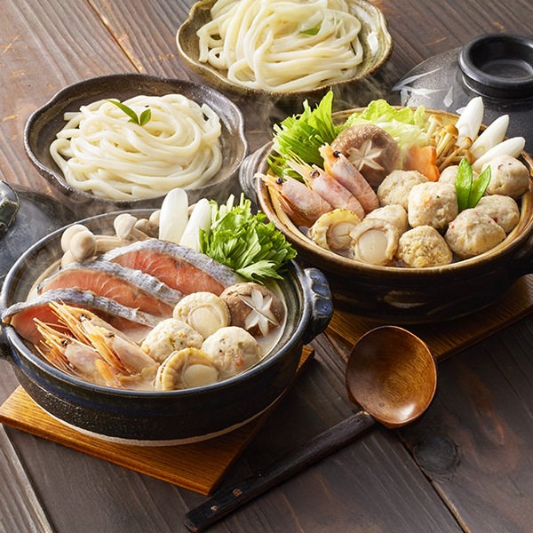 北海道産の秋鮭、帆立や、他にも海老、つみれなどを、味噌仕立てのたれでいただく北海道の郷土料理「石狩鍋」の具材と、かに、えびなど4種類のつみれの他にも海老、帆立などをあっさりした醤油仕立てのたれでいただく海鮮つみれ鍋の具材を、それぞれ1〜2人前の少量タイプにセットしました。お好みで野菜などを足していただくだけで本格的な鍋をお楽しみいただけます。〆はうどんでどうぞ!!