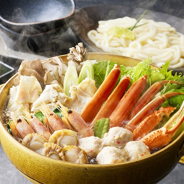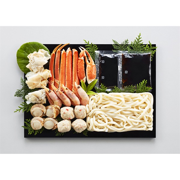 本ずわいがにと、帆立や海老、かに入つみれなどの各種魚介具材を詰め合わせた冬の定番"かに鍋"の具材セットです。蟹好きの期待を裏切らないボリュームたっぷりの具材とご家庭で白菜や人参などの野菜をご用意いただき、醤油仕立てのタレでお召し上がりください。シメはうどんでどうぞ!!