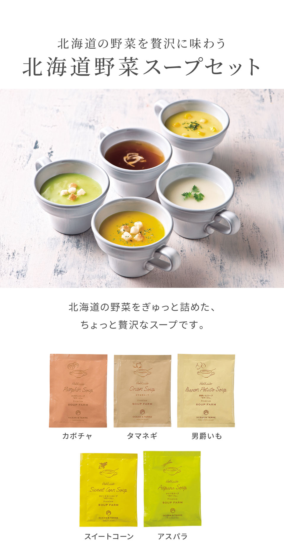 ●箱:約290×225×60mm●現品:北海道産かぼちゃス−プ16.5g×1、北海道産玉ねぎス−プ7g×1、北海道産男爵いもス−プ20g×1、北海道産スイートコーンス−プ16.5g×1、北海道産アスパラス−プ16.5g×1【賞味期限:メーカー製造より約6ヶ月】【小麦・乳成分】