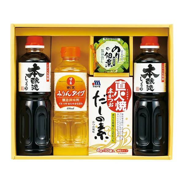 ●現品:サンビシ本醸造しょうゆ500ml×2・日の出割烹みりんタイプ400ml・島乃香のり佃煮80g・マルトモ直火焼本かつおだしの素(4g×10袋入) 【乳成分・小麦】【賞味期限:メーカー製造より約常温360日間】【JPN】