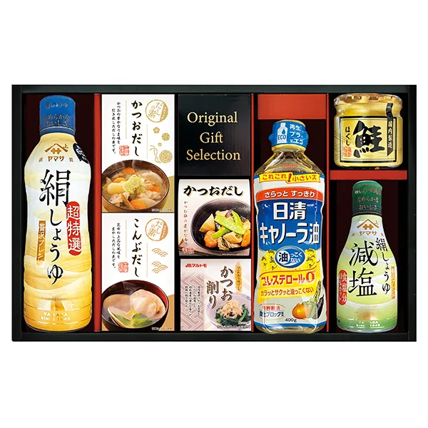 ●現品:ヤマサ絹しょうゆ450ml・ヤマサ絹しょうゆ減塩200ml・かね七かつおだし(4g×5)・かね七こんぶだし(4g×5)・マルトモかつおパック(0.7g×3)・シーラックかつおだし(4g×3)・鮭ほぐし50g・日清キャノーラ油400g 【乳成分・小麦】【賞味期限:メーカー製造より約常温360日間】【JPN】