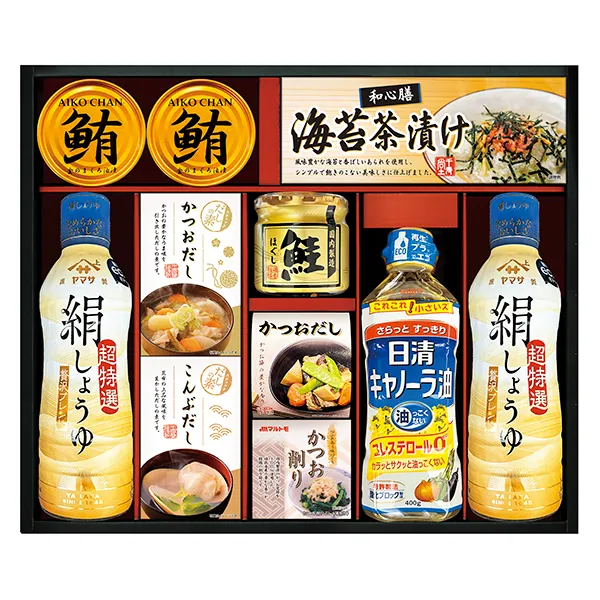 ヤマサの絹しょうゆを中心に詰合せた毎日の食卓へお届けする調味料バラエティギフト。