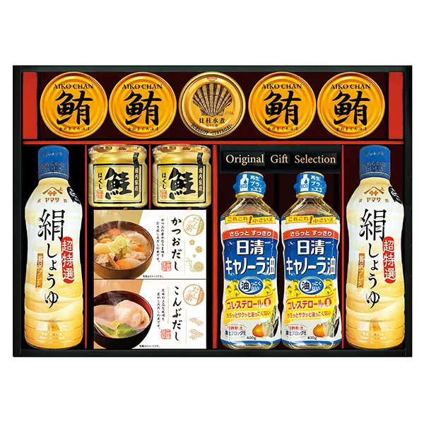 ●現品:ヤマサ絹しょうゆ450ml×2・かね七かつおだし(4g×5)・かね七こんぶだし(4g×5)・まぐろ油漬け70g×4・鮭ほぐし50g×2・日清キャノーラ油400g×2・宝幸貝柱水煮ほぐし身65g 【乳成分・小麦】【賞味期限:メーカー製造より約常温540日間】【JPN】