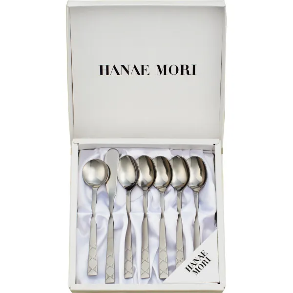 1965年ニューヨークで初の海外コレクション発表後、国内外でも数々の作品を発表。今日ではライフスタイルの全てに関わり美しく豊かな毎日を過ごせるようハナエモリならではのスタイルを提案し続けています。柄の部分にシンボルマークの蝶が刻印されて、印象的なハナエモリのカトラリーセットです。