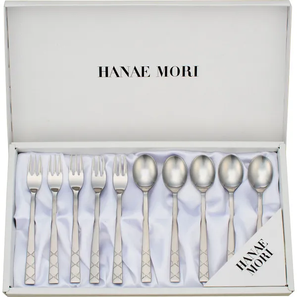 1965年ニューヨークで初の海外コレクション発表後、国内外でも数々の作品を発表。今日ではライフスタイルの全てに関わり美しく豊かな毎日を過ごせるようハナエモリならではのスタイルを提案し続けています。柄の部分にシンボルマークの蝶が刻印されて、印象的なハナエモリのカトラリーセットです。