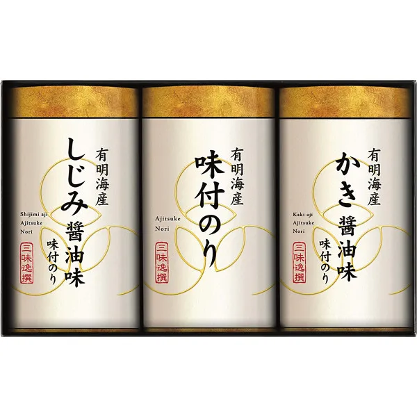 有明海産の風味豊かな味付海苔としじみ醤油味、かき醤油で仕上げた味付海苔の3種類の味わいを楽しめるバラエティギフトです。