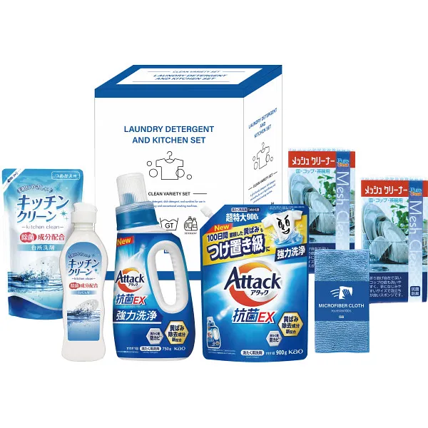 ●花王アタック抗菌EX本体750g・花王アタック抗菌EX詰替900g・キッチンクリーン250ml・キッチンクリーン詰替200ml・マイクロファイバークロス(約20×20cm)×各1、メッシュクリーナー×2