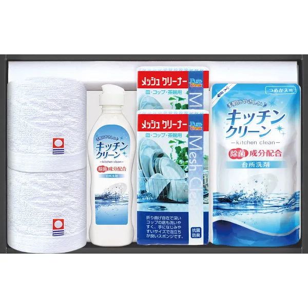 ●ウォッシュタオル(約30×34cm)・メッシュクリーナー×各2、キッチンクリーン250ml・キッチンクリーン詰替200ml×各1
